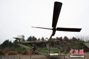 2014年3月12日,湖南岳阳,只有初中文化水平、从来没见过真正飞机的农民李厚胜和自己用摩托车发动机改造制成的“鱼鹰直升机”,李厚胜为其取名“马上飞”。
