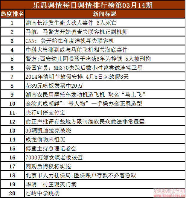 2014年3月14日乐思每日舆情热点排行榜导读:湖南长沙发生街头砍人事件 6人死亡;马航:马警方开始调查失联客机正副机师;CNN: 美开始在印度洋找寻失联客机;中科大检测到或与马航飞机相关海底事件;警方:西安幼儿园喂孩子吃药6年为挣钱 5人被刑拘……