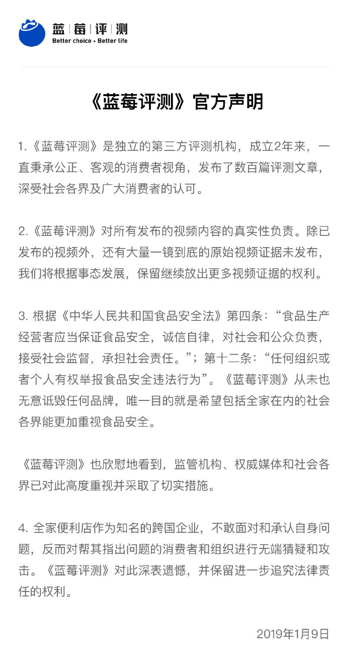 1月9日,@蓝莓评测 发布官方声明,称对视频内容真实性负责,保留大量原始视频未发布。对于全家便利店不敢面对和承认自身问题,深表遗憾,并保留进一步追究法律责任的权利。