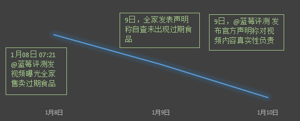 1月8日,@蓝莓评测 发视频曝光全家售卖过期食品,舆情萌发,随后人民网、凤凰网、澎湃新闻、财经网、@每日经济新闻、@中国新闻网、@中国之声、@中国经营报、@中国日报等各大媒体及官方微博纷纷报道该消息,引起网友热议,当日舆情达到最大;随后舆情开始递减,1月9日,全家及@蓝莓评测发布声明;截至1月10日,舆情仍呈下降趋势。