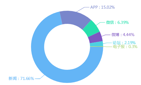 截至1月10日,此次舆情传播媒介分布中,排在采集前三位的是新闻、APP和微信。新闻数据占比为71.66%,APP和微信分别占15.02%和6.39%。