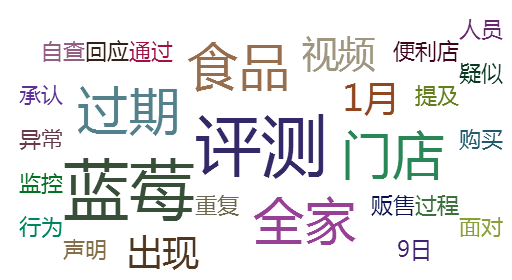 此次舆情事件中,高频词主要是:“蓝莓”、“评测”、“全家”、“门店”、“过期”、“食品”等。