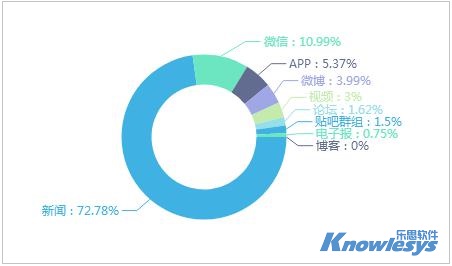 乐思软件舆情监测数据显示,截至目前此次舆情监测媒体构成类型中,排在采集来源榜前三位的是新闻、微信和APP。新闻数据占比为72.78%,微信和APP分别占10.99%和5.37%。