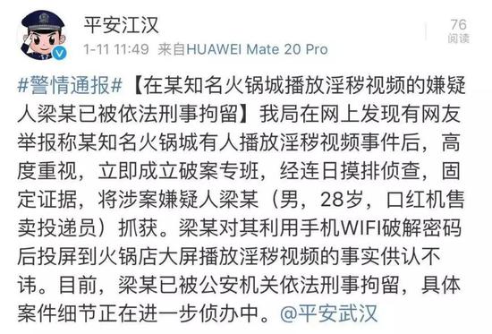 今天(11日),武汉市江汉区公安分局官方微博@平安江汉 发布警情通报:在某知名火锅城播放淫秽视频的嫌疑人梁某已被依法刑事拘留。