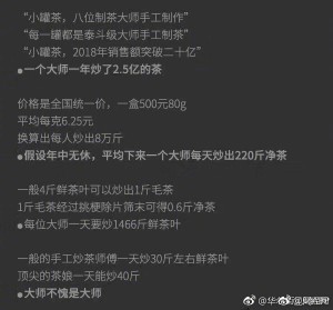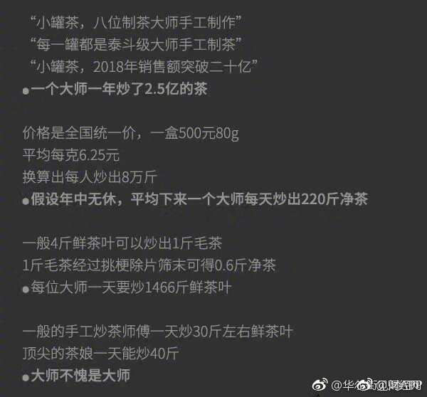 日前一张“小罐茶大师会不会累坏了”的图片广为流传,其推算按照小罐茶超20亿的销售额,大师每天要炒1466斤的鲜茶叶来调侃小罐茶“大师作”的宣传点