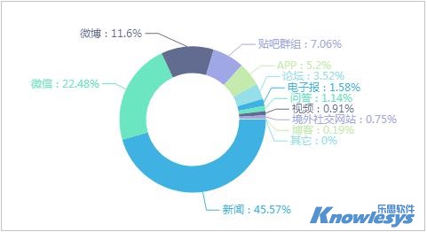 乐思软件舆情监测数据显示,截至目前此次舆情监测媒体构成类型中,排在采集来源榜前三位的是新闻、微信和微博。新闻数据占比为45.57%,微信和微博分别占22.48%和11.60%。