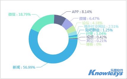 乐思软件舆情监测数据显示,截至目前此次舆情监测媒体构成类型中,排在采集来源榜前三位的是新闻、微信和APP。新闻数据占比为56.99%,微信和APP分别占18.79%和8.14%。