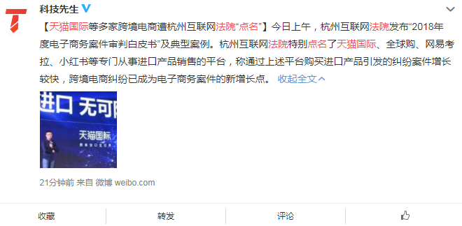 今日上午,杭州互联网法院发布“2018年度电子商务案件审判白皮书”及典型案例。杭州互联网法院特别点名了天猫国际、全球购、网易考拉、小红书等专门从事进口产品销售的平台,称通过上述平台购买进口产品引发的纠纷案件增长较快,跨境电商纠纷已成为电子商务案件的新增长点。