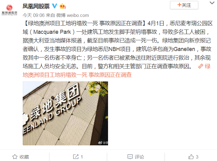 4月1日,悉尼麦考瑞公园区域(Macquarie Park)一处建筑工地发生脚手架坍塌事故,导致多名工人被困,据澳大利亚当地媒体报道,截至目前事故已造成一死一伤。绿地集团向新京报记者确认,发生事故的项目为绿地悉尼NBH项目,建筑总承包商为Ganellen,事故致其中一名伤者不幸身亡;另一名伤者已被紧急送往附近医院进行救治,其余现场施工人员均安全无恙。目前,警方和相关主管部门正在调查事故原因。
