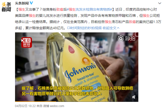 近日,印度药品控制中心对美国品牌强生的婴儿洗发水进行质量检测,发现产品中含有有害物质甲醛和石棉,但强生公司拒绝承认这一检查结果。据统计,仅在全美范围内,目前控告强生滑石粉产品致癌的案例已超1.3万多起,累计赔偿金额高达48亿元。