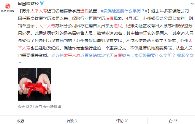4月8日,苏州银保监分局公布的一则罚单显示,太平人寿苏州分公司因存在销售人员学历造假、记账凭证签收有出入被苏州银保监分局处罚。此番处罚针对的是基层销售人员,数量多达93名,其中抽查证实的是两人,其余91人只是疑似?还是因为没有抽到的?苏州银保监局则没有交代,不过即使是两人假学历坐实,苏州太平人寿也已经触及红线。保险作为金融行业的一个重要分支,不仅经营机构需要牌照,从业人员也需要相关资质。