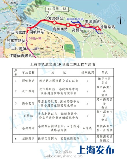 10号线二期全长10.08公里,建成后将为浦东新区与市中心、与虹桥枢纽的联系开辟一条新的快捷路线。二期项目设国帆路、双江路、高桥西、高桥、港城路(可换乘6号线)、基隆路六个站。其中,国帆路站为地下三层岛式车站,其余车站均为高架二层或三层车站。线路将采用A型车6节编组。