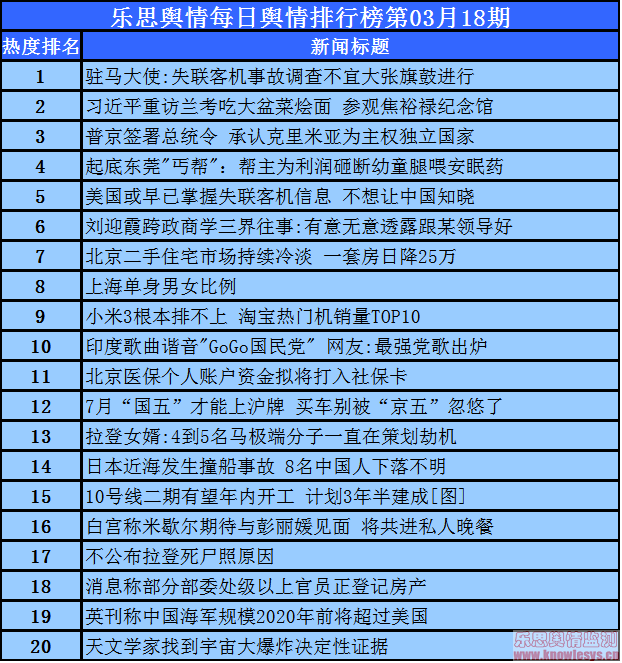 2014年3月18日乐思每日舆情热点排行榜导读:驻马大使:失联客机事故调查不宜大张旗鼓进行;习近平重访兰考吃大盆菜烩面 参观焦裕禄纪念馆;普京签署总统令 承认克里米亚为主权独立国家;起底东莞”丐帮”:帮主为利润砸断幼童腿喂安眠药;美国或早已掌握失联客机信息 不想让中国知晓……