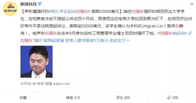 【舆情速递】刘强东案再起波澜!涉事女大学生起诉索赔超5万美元