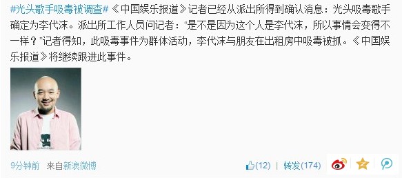 3月18日,有媒体爆料称因选秀节目一夜成名的某光头歌手卷入吸毒事件,消息一出,引起不少网友的猜测并将目标锁定李代沫。得知爆料后,媒体第一时间联系了李代沫经纪公司灿星宣传总监陆伟(微博),对方接到电话后表现惊讶,先是询问爆料来源,然后迅速否认“我们工作排得很满,最近还有活动。”