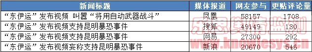 19日媒体报道“东伊运发布视频支持昆明暴恐”的新闻后,立即在网上引起广泛的关注和议论,网友对该新闻话题的反映强烈,更有众多媒体转载报道和大批网友的参与话题讨论。来自乐思舆情监测系统19日16时的监测数据显示,截至当前,该话题的媒体曝光量达594篇,搜狐、新浪、凤凰、网易该话题的报道吸引超过15万网友参与话题,跟帖2000多条。从系统采集的网友跟帖来看,对于东伊运的嚣张表现,网友回应打击恐怖势力不容手软。