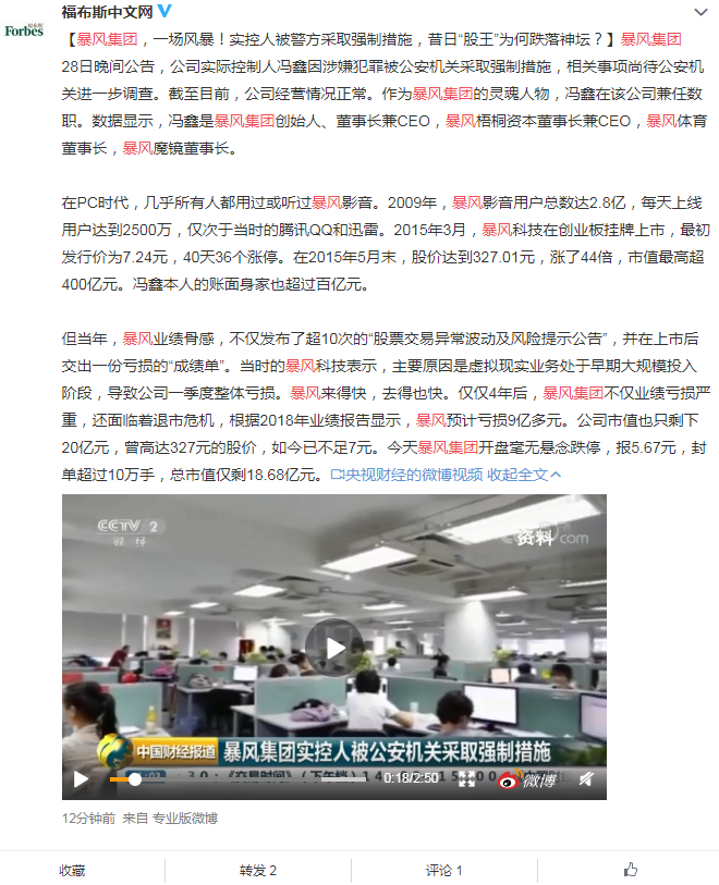 7月29日,乐思舆情监测系统 监测到@福布斯中文网  发布的与暴风集团相关的热点舆情。