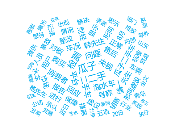 此次舆情事件中,高频词主要是:“瓜子”、“二手”、“检测”、“泡水车”、“问题”、“央视”等。