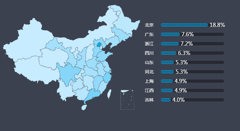 地域分布图可知,话题讨论北京民众参与最高,其次为广东,排名第三为浙江,整体讨论量主要聚集在中国东南部。