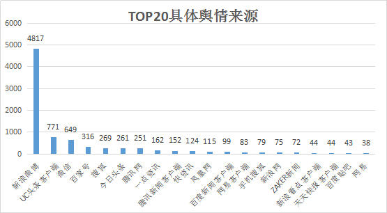 截至8月25日,舆情来源top20中,微博第一,其次为UC头条客户端,其后依次是:微信、百家号、搜狐、今日头条、腾讯网、一点资讯、腾讯新闻客户端、快资讯、凤凰网、百度新闻客户端、网易客户端、手机搜狐、新浪网、ZAKER新闻、新浪看点客户端、天天快报客户端、百度贴吧,网易。
