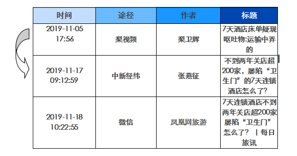 分析绿7天酒店床单现疑似呕吐物事件总体舆情数据概况: 2019年11月5日事件发生后反响较低,各平台只有零星转载,其中原因主要有5日2019中国国际进口博览会及6日滴滴顺风车试运营等热点话题的覆盖,另一方面是未有权威媒体对事件报道,事件曝光率较低。后事件发展平缓,7天酒店就此事未有回应及引导,错失舆情应对先机,直到17日中新经纬发布稿件:“不到两年关店超200家,屡陷“卫生门”的7天连锁酒店怎么了?”媒体由卫生事件引出话题“两年关店超200家”,民众对此展开激烈讨论,后舆情由发展期迅速进入爆发期,18日,舆情传播达到峰值,当日微博讨论量为310条。