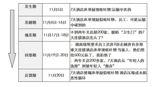 1、舆情初期发展平缓,发生期至爆发期时间较长,7天酒店在初期未有关注,放任舆情发展,使得事件最终爆发;