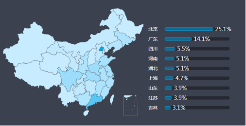 4、 民众来源较多集中在北京,广东等地区,且男性参与度显著多余女性,在处理舆情的过程中,监测重点应着重与北京及广东区域。
