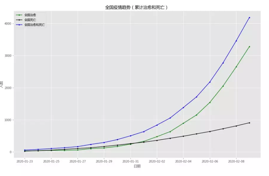 截至2月9日24:00,全国累计治愈病例3281人,死亡病例908人,其变化情况如下图2。目前新冠肺炎还没有特效药,只能依靠患者自身免疫力对抗病毒,所以其总人数保持类似指数形式增长。