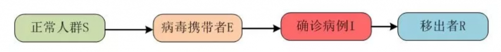 实际中的人群类型转换过程如下图3所示。根据疫情的特点分析可知:(1)疑似病例中只有部分病例为新冠病毒携带者,占比可能随着疫情发展动态变化;(2)已知有媒体反映无症状携带者也具有传染能力,这类人由于无症状难以被识别可以归为正常人群;(3)死亡病例和治愈病例均退出了疫情传播过程,为了方便分析我们将其归类为移出者。经以上分析,图3的人群类型转换过程就简化为图4的SEIR模型。