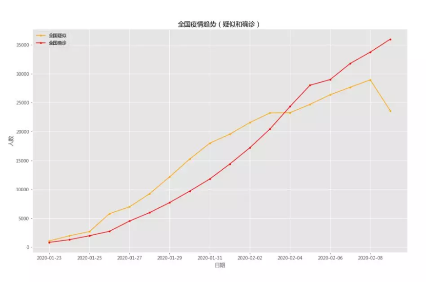 截至2月9日24:00,全国现有确诊病例35982人,疑似病例23589人,其变化情况如下图1。