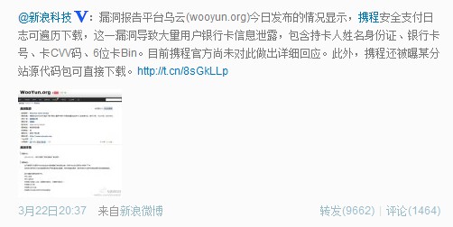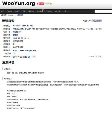 据漏洞报告平台乌云网22在其官网上公布了一条网络安全漏洞信息显示,携程(49.49, 0.01,0.02%)安全支付日志可遍历下载,导致大量用户银行卡信息泄露(包含持卡人姓名身份证、银行卡号、卡CVV码、6位卡Bin),并称已将细节通知厂商并且等待厂商处理中。此外,携程还被曝某分站源代码包可直接下载(涉及数据库配置和支付接口信息)。