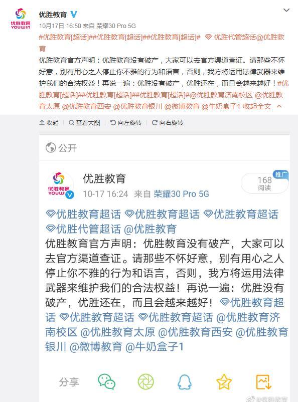 近日,乐思舆情监测中心关注到优胜教育破产传闻在网络上传播广泛,针对此事,17日优胜教育官方发布声明称:“优胜教育没有破产,大家可以去官方渠道查证。请那些不怀好意,别有用心之人停止你不雅的行为和语言,否则,我方将运用法律武器来维护我们的合法权益!优胜没有破产,优胜还在,而且会越来越好!”