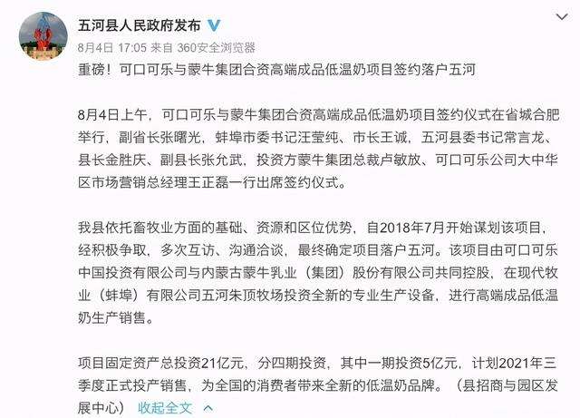 而在今年8月,“五河县人民政府发布”微博账号曾发布消息称,可口可乐与蒙牛集团合资高端成品低温奶项目签约仪式在省城合肥举行。