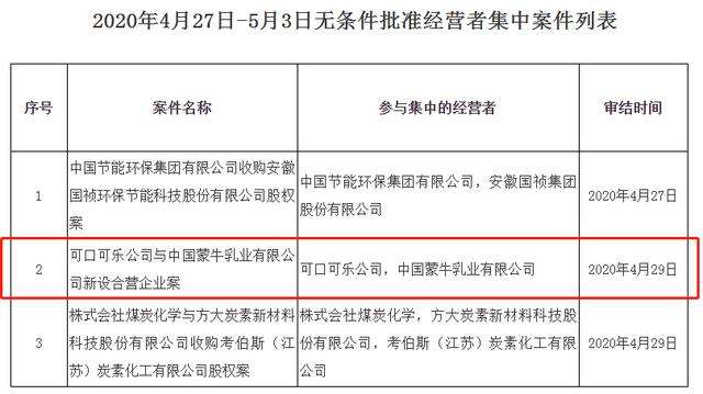 事实上早在今年4月,国家市场监督管理总局官网的通报显示,可口可乐公司与中国蒙牛乳业有限公司新设合营企业案已在今年4月29日审结。