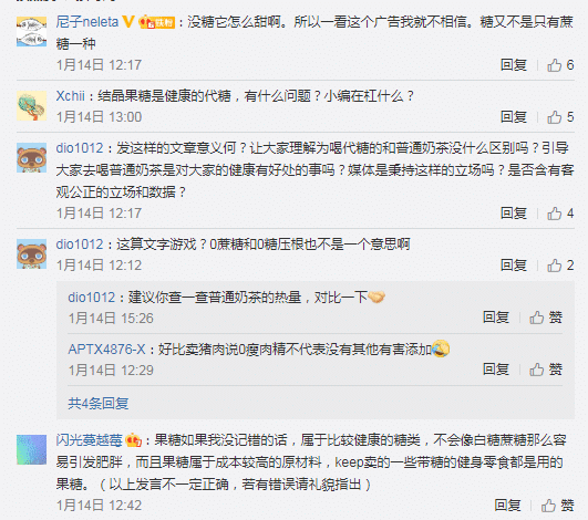 可以看出,对于含糖的文字表述,在网友间也仍存在争议。