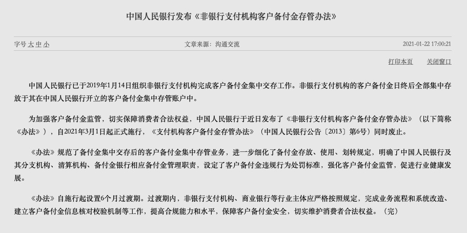 1 月 22 日消息 根据中国人民银行的消息,为加强客户备付金监管,切实保障消费者合法权益,中国人民银行于近日发布了《非银行支付机构客户备付金存管办法》,自2021年3月1日起正式施行。
