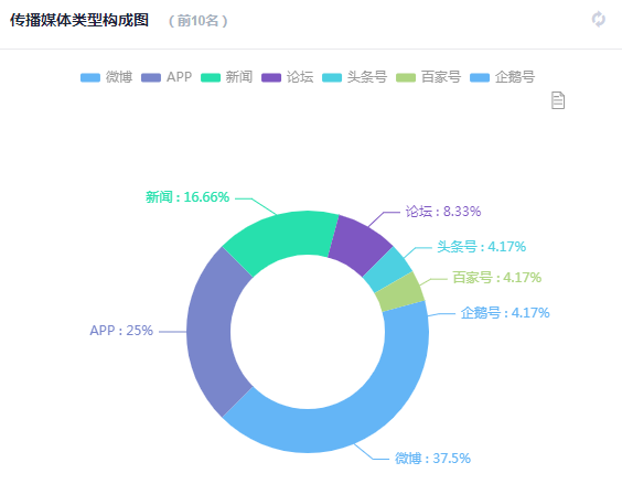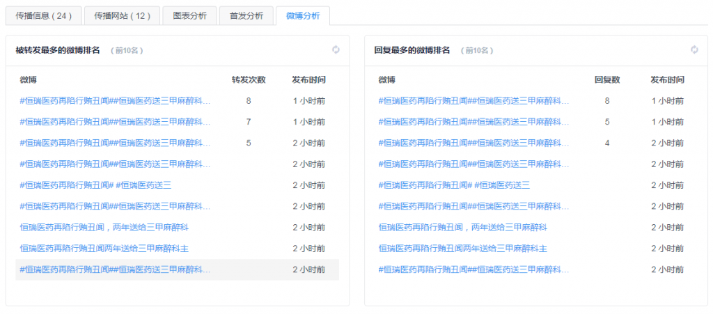 微博所占比例最高,主要是微博话题#恒瑞医药再陷行贿丑闻##恒瑞医药送三甲麻醉科主任140万#引关注。微博用户@全景网发布的【#恒瑞医药再陷行贿丑闻# #恒瑞医药送三甲麻醉科主任140万#】