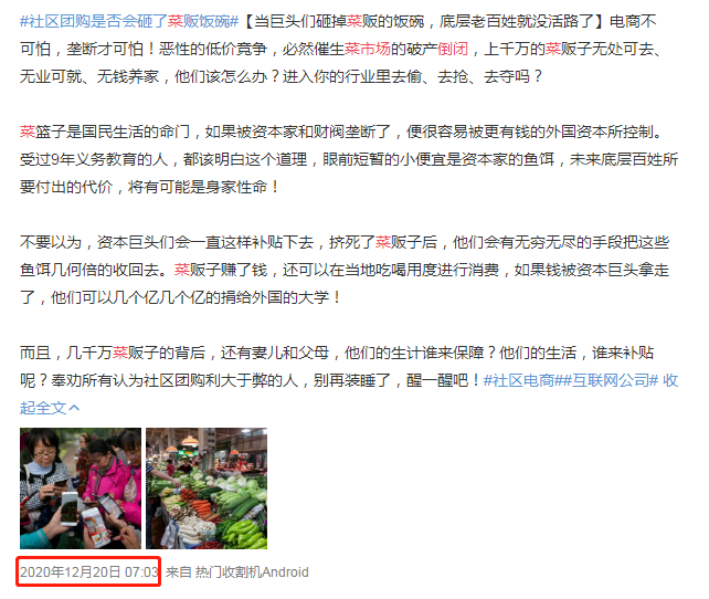 早在去年,在网络上就有各种声音讨论社区团购对于菜市场的危害,指责资本剥削。