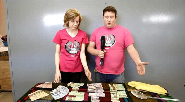 瑞安·林赛和凯蒂·萨莫是加拿大西南部卡尔加里市的电台主持,近日他们在节目中设计了一个环节,主持人现场准备一笔钱,让观众投票决定是当场烧毁还是捐给某个听众。如果听众选择后者,那么主持人会要求听众解释这笔钱的用途。