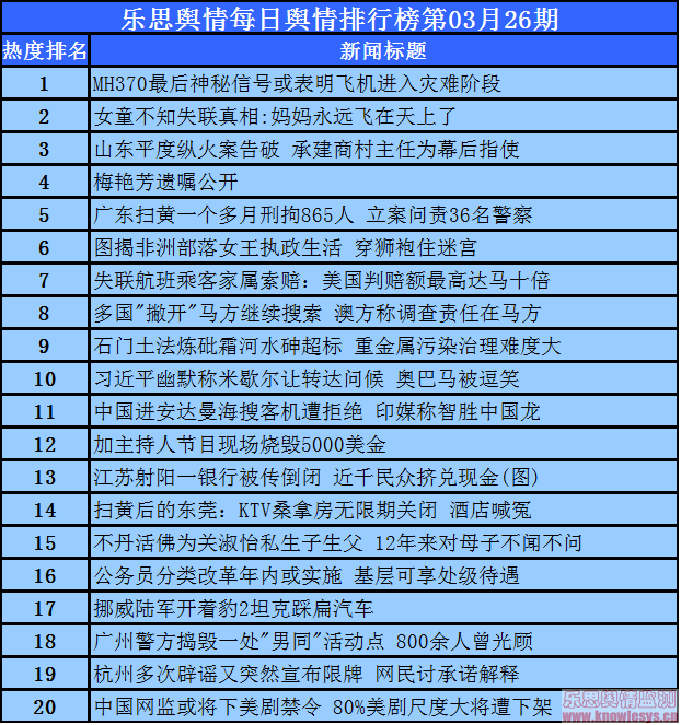 2014年3月26日乐思每日舆情热点排行榜导读:MH370最后神秘信号或表明飞机进入灾难阶段;女童不知失联真相:妈妈永远飞在天上了;山东平度纵火案告破 承建商村主任为幕后指使;梅艳芳遗嘱公开;广东扫黄一个多月刑拘865人 立案问责36名警察……