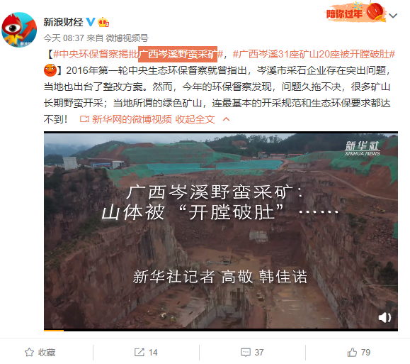 该舆情的主要内容是:2016年第一轮中央生态环保督察就曾指出,岑溪市采石企业存在突出问题,当地也出台了整改方案。然而,今年的环保督察发现,问题久拖不决,很多矿山长期野蛮开采;当地所谓的绿色矿山,连最基本的开采规范和生态环保要求都达不到!原本青翠的山林被“开膛破肚”,劈山采石作业面落差近百米如一面高墙,废土废石随意丢弃掩埋大量树木植被……今年4月,记者随中央第七生态环境保护督察组对广西壮族自治区开展督察发现,梧州岑溪市花岗岩矿山粗放开采问题突出,随意倾倒废土废石、洗砂废泥等现象普遍,造成严重生态破坏和环境污染。