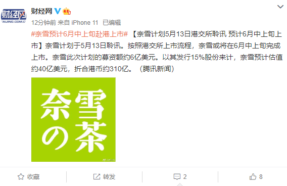 该舆情主要是:奈雪计划于5月13日聆讯。按照港交所上市流程,奈雪或将在6月中上旬完成上市。奈雪此次计划的募资额约6亿美元。以其发行15%股份来计,奈雪预计估值约40亿美元,折合港币约310亿。