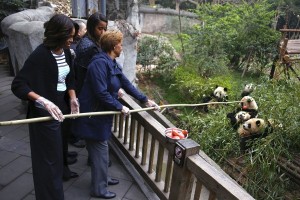 3月26日10时许,成都大熊猫繁育研究基地的绿林中,几只胖乎乎的大熊猫“挂”在高高的树枝上,或发呆,或打盹儿,或仰望天空……这一幕落在美国总统奥巴马夫人米歇尔·奥巴马和她的母亲及女儿眼中,一家人瞬间被“萌翻”。“简直太可爱了!”