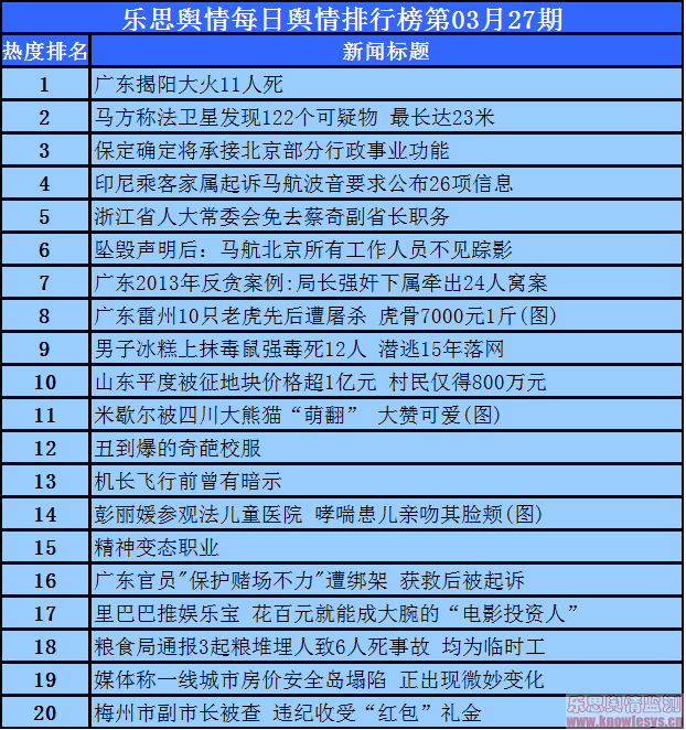 2014年3月27日乐思每日舆情热点排行榜导读:广东揭阳大火11人死;马方称法卫星发现122个可疑物 最长达23米;保定确定将承接北京部分行政事业功能;印尼乘客家属起诉马航波音要求公布26项信息;浙江省人大常委会免去蔡奇副省长职务……