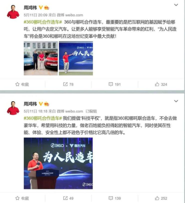 周鸿祎近日便在360集团智能汽车战略沟通会上宣布:将与哪吒汽车合作打造“人民的汽车”,并将领投哪吒汽车 D 轮融资,成为其第二大股东。