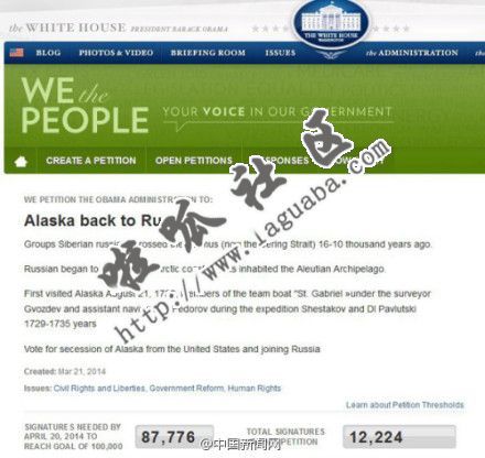 据UPI合众国际社3月24日消息,近日美国白宫请愿网站收到一条请愿,要求美国将阿拉斯加归还给俄罗斯,目前,该请愿已经征集了超过18000多人签名。