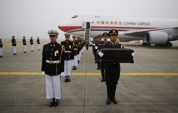 中方交接在韩志愿军烈士遗骸代表团团长、民政部优抚安置局局长邹铭与韩方代表、韩国国防部军备控制次长文尚均准将现场签署了交接书,确认交接437具志愿军烈士遗骸以及相关遗物。