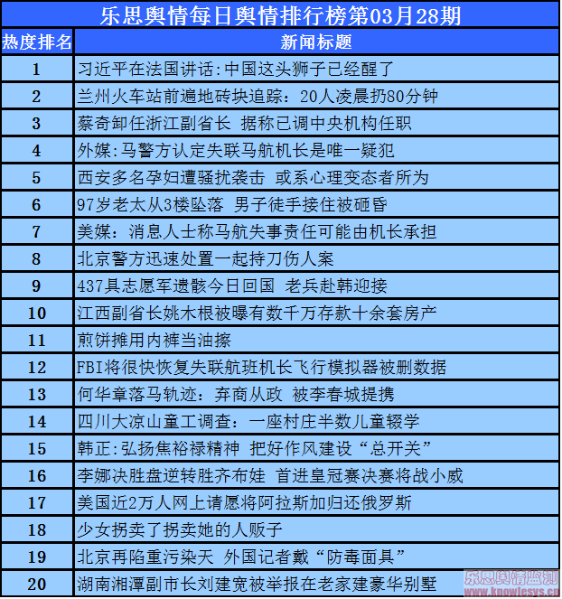 2014年3月28日乐思每日舆情热点排行榜导读:习近平在法国讲话:中国这头狮子已经醒了;兰州火车站前遍地砖块追踪:20人凌晨扔80分钟;蔡奇卸任浙江副省长 据称已调中央机构任职;外媒:马警方认定失联马航机长是唯一疑犯;西安多名孕妇遭骚扰袭击 或系心理变态者所为……