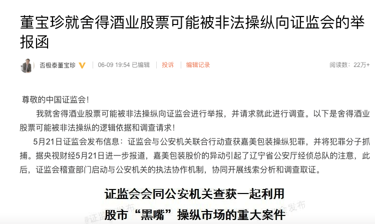 6月9日晚间,认证为凌通盛泰投资管理董事长的董宝珍,在个人社交平台发布一则《董宝珍就舍得酒业股票可能被非法操纵向证监会的举报函》,称 “尊敬的中国证监会,我就舍得酒业股票可能被非法操纵向证监会进行举报,并请求就此进行调查。”