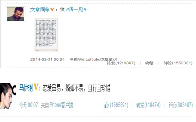 3月31日凌晨,文章在微博发表声明,回应与姚笛出轨传闻,称“咎由自取”“愿承担一切后果”,并道歉称辜负了马伊琍和孩子,辜负了家庭。相隔四分钟后,马伊琍也在“外遇门”后首次发声,称“婚姻不易,且行且珍惜”。有知名微博分析称以上言论似乎暗示文章向家庭道歉,与姚笛分手,并暂时不会离婚,而马伊琍的回应,似乎也预示文章已获得原谅。